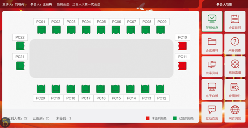 1.會前準(zhǔn)備:會前準(zhǔn)備包含會議室預(yù)約及管理,同時對確定的會議室設(shè)備進(jìn)行開會前資料上傳,席位的準(zhǔn)備及參會人員名字的錄入等。